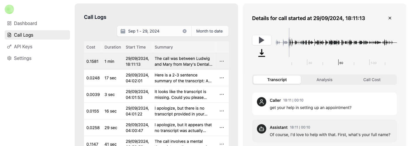 Manage call logs, transcripts, and audio in one split-screen dashboard.